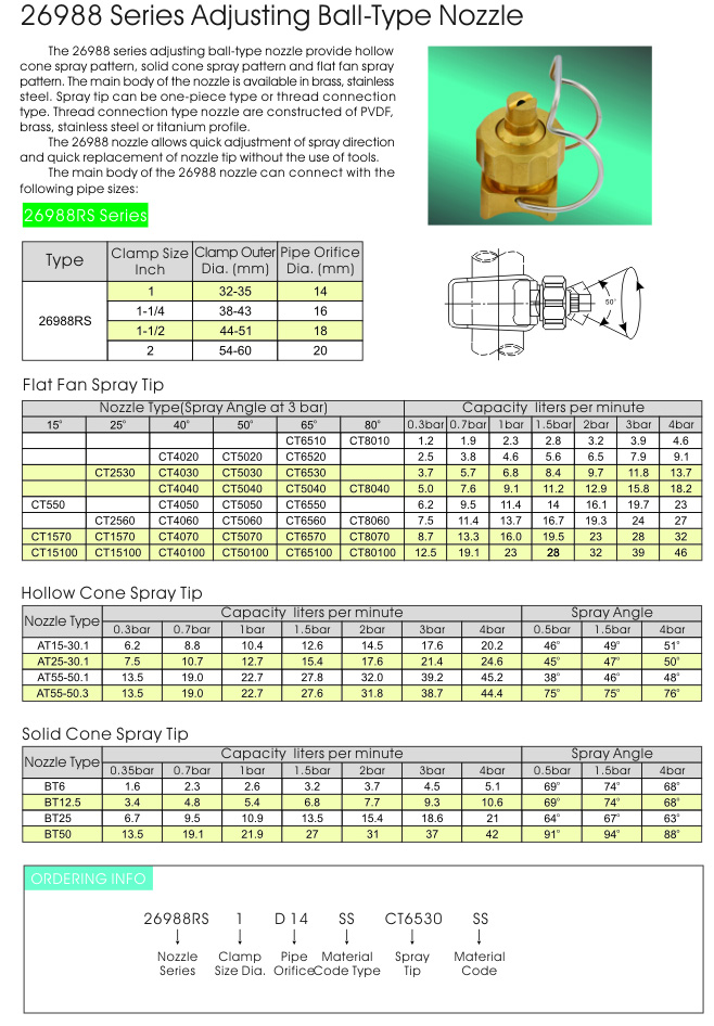 Adjusting ball-Type Nozzle ออกแบบมาให้มีการ clamp ท่อได้สองแบบในรุ่น 26988/27988 Series ที่เป็นลวดสปริงรัดท่อ และรุ่น 155 Series ที่ยึดด้วยเกลียว